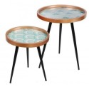 Cada mesa presenta un tablero decorado con patrones distintos, que no solo aportan un aspecto estético atractivo, sino también versatilidad en su uso. Su tamaño compacto permite colocarlas en una variedad de espacios, ya sea en una sala de estar para complementar el mobiliario existente o en un recibidor donde pueden servir como una declaración de estilo.