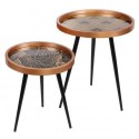 Estas mesas auxiliares redondas de estilo Art Deco son el complemento perfecto para quienes buscan añadir un toque de sofisticación y elegancia a su hogar. Fabricadas con materiales de alta calidad, estas piezas combinan un diseño geométrico único con un acabado en tonos cobrizos y patas negras, creando un contraste visual impresionante que captura la esencia del diseño Art Deco.